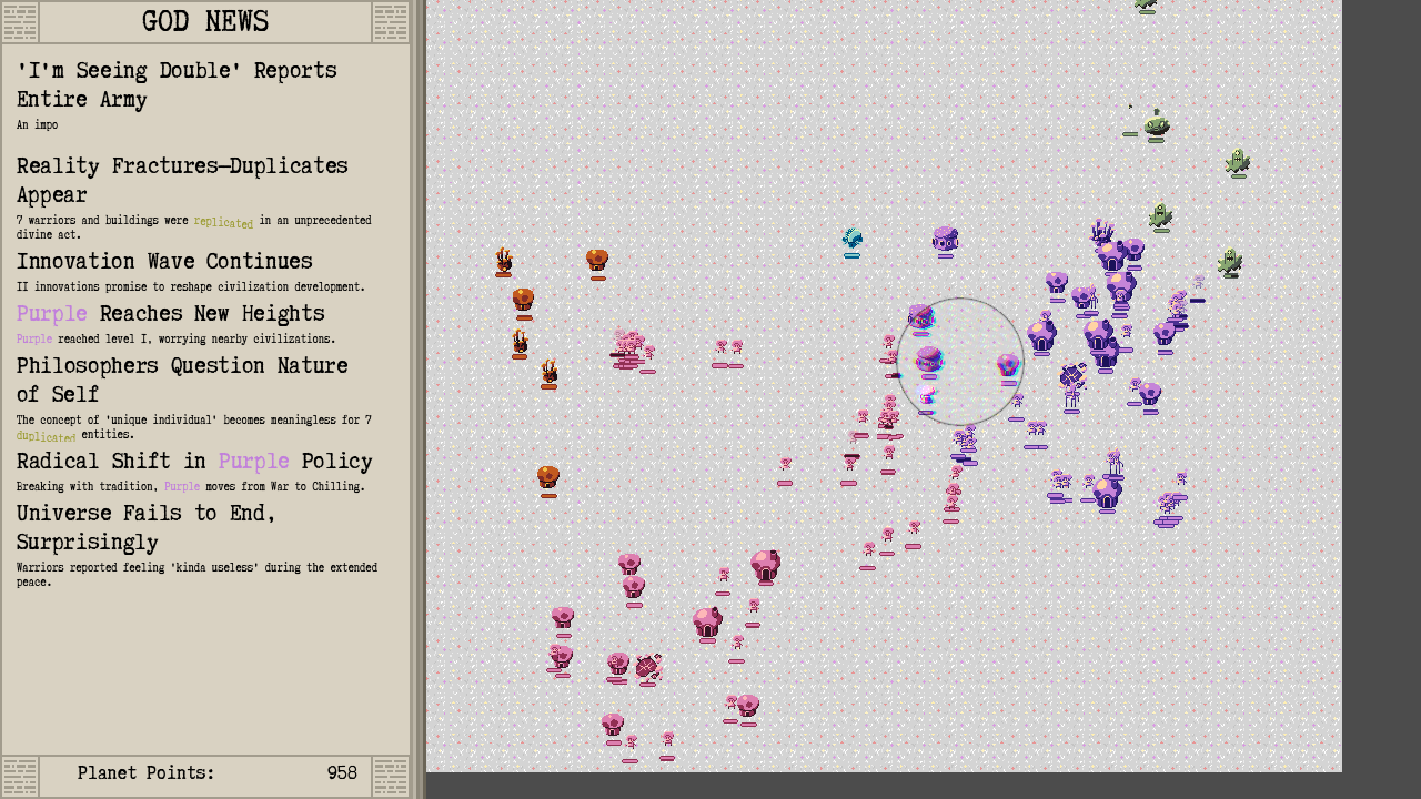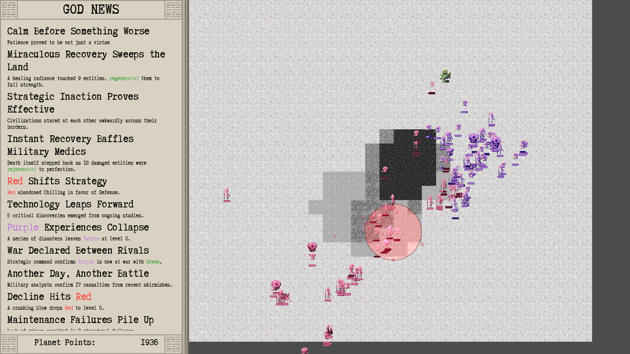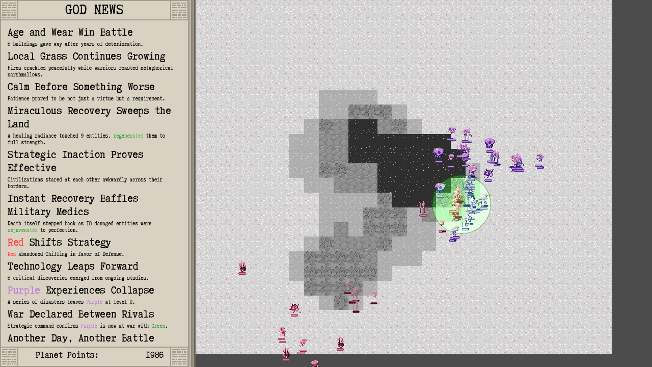 Shapesim is a godsim where you watch civilizations grow and fight and intervene with various godly abilities. Read the latest news about who progressed, killed or perished and generate the best headlines.